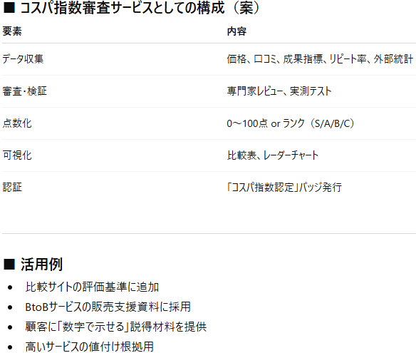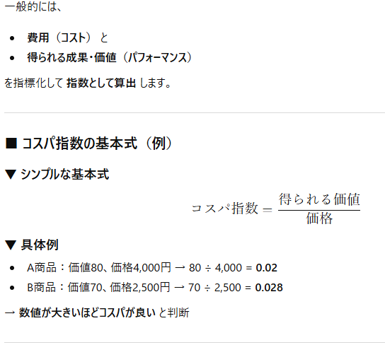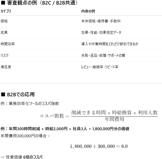 商品・サービスの コストパフォーマンス を数値化し、複数の選択肢を 客観的に比較できるようにする評価方法